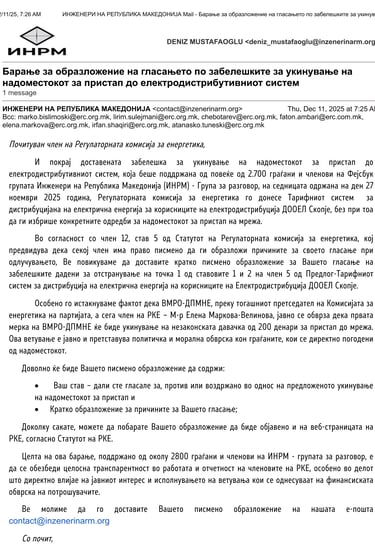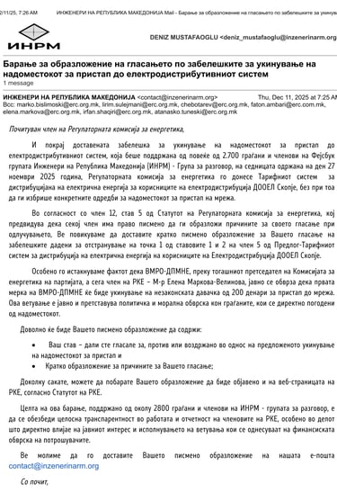 ИНРМ, со поддршка од околу 2.800 граѓани, достави барање до секој член на РКЕ за индивидуално образложение за гласањето за надоместокот од 200 денари за пристап до електродистрибутивниот систем.